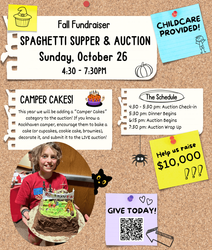 Join us for the world famous Rockhaven baked good LIVE auction! The auction is a fun and creative way to bring our camp community together and help support future campers, facilities renovations, and programming needs. This year we will be adding a “Camper Cakes” category to the auction! If you know and love a Rockhaven camper, encourage them to bake a cake (or cupcakes, cookie cake, brownies), decorate it, and submit it to the auction.